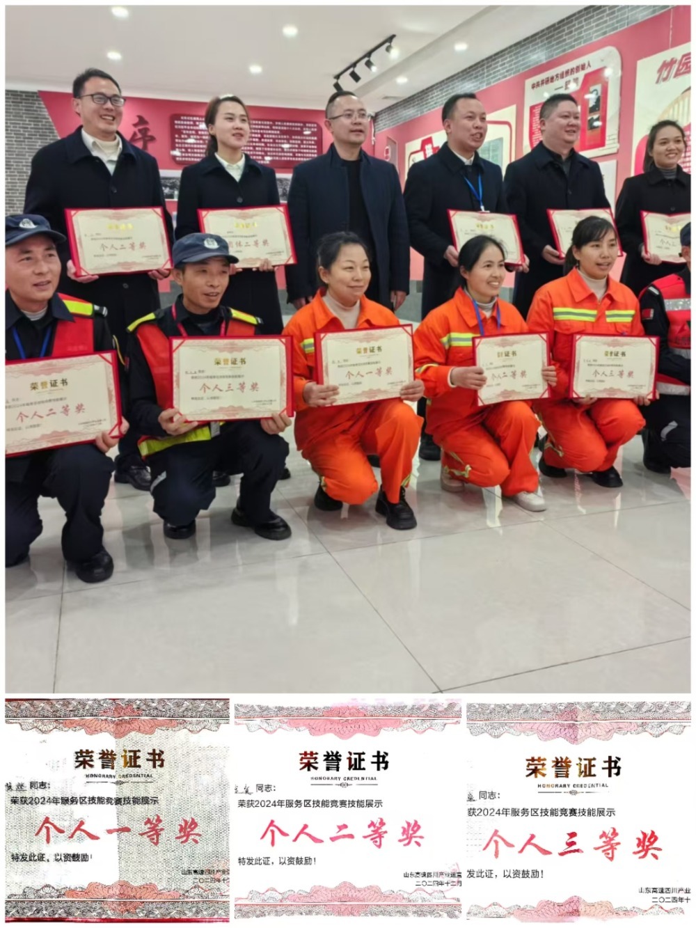 经过激烈角逐,张顺林同志脱颖而出,凭借着在各个环节近乎完美的表现荣获技能展示个人一等奖。他在队列展示中始终保持着最佳状态,动作规范且富有节奏感;在防爆器材展示时,其力度与技巧的完美结合令人赞叹。杨富贵同志则以稳健的发挥荣获个人二等奖,他在仪容仪表展示环节给人留下深刻印象,自我介绍简洁而有力,在其他项目中也表现出色,展现出了良好的综合素质。熊永康同志荣获个人三等奖,他在交通手势展示环节中,手势标准、动作流畅,展现出了对业务的熟练掌握。他们用精湛的技艺和昂扬的斗志为公司赢得了荣誉,充分彰显了龙王保安团队的专业素养与精神风貌。