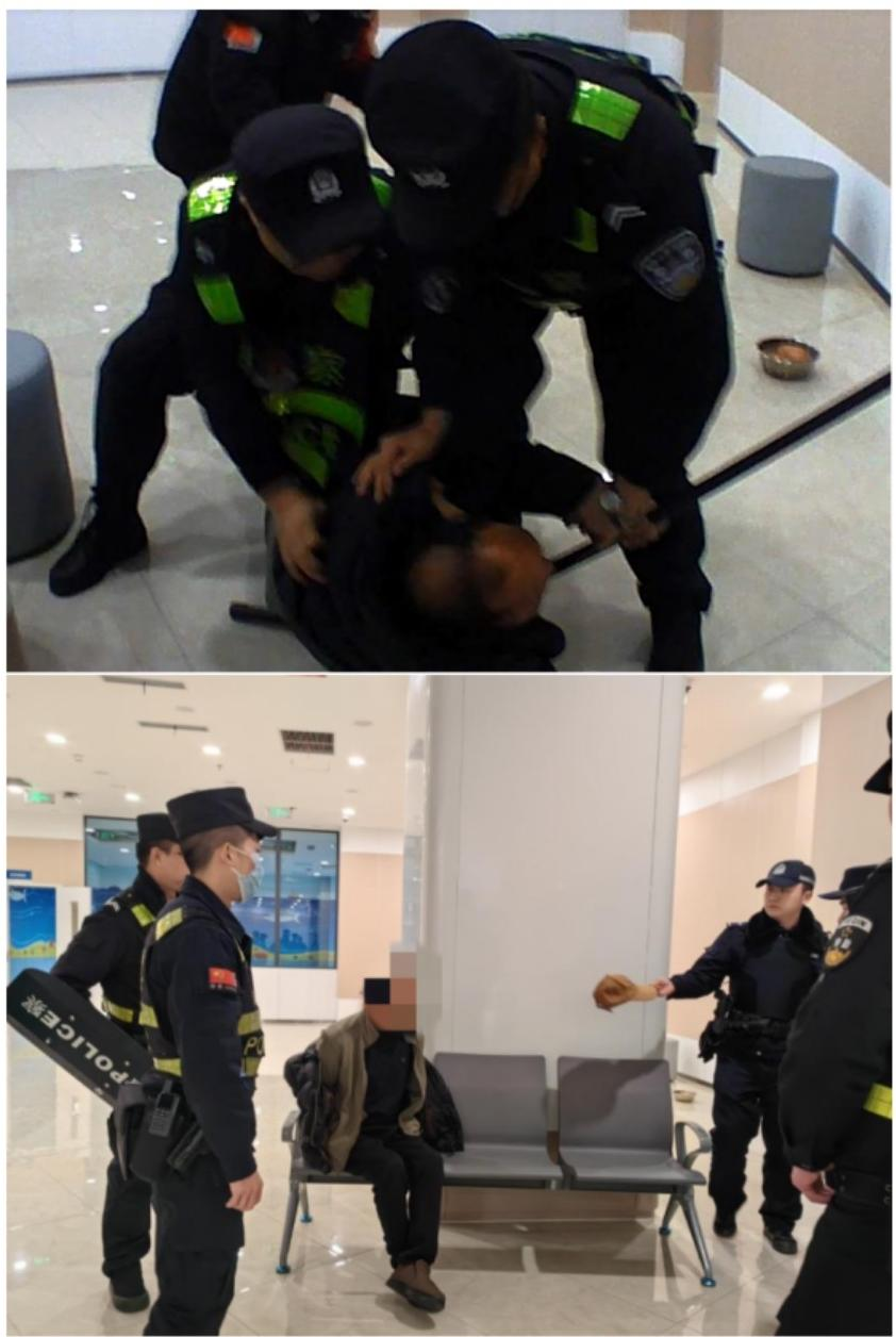 13日下午4时许, 一醉酒男子违规在医院门诊儿保大厅处 削土豆欲做饭,期间与前来询问制止的保洁人员发生冲突,并挥 动水果刀高声叫嚣威胁保洁人员和旁边群众,区域责任保安员见 状立即制止并呼叫处突队员到场增援。闻讯后警务室4名处突队员立即按要求发起“警保联动”并持安防器械赶到现场控制事态,疏散周边群众,队员们熟练运用安防技能逐步将醉酒男子逼至无人角落,合力将其制服。安谷派出所公安民警到场对其进行了全面盘查,发现该男子随身带有水果刀且属醉酒状态,有较高危险性,民警依法将该男子带回公安机关作进一步调查处理。