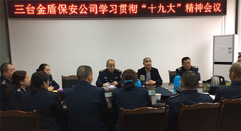 本网讯(通讯员 刘寿强)10月31日上午,三台县金盾保安服务有限公司召开会议,学习贯彻“十九大精神”,公司管理人员、各保安中队正副中队长、保安班组长共28人参加会议。