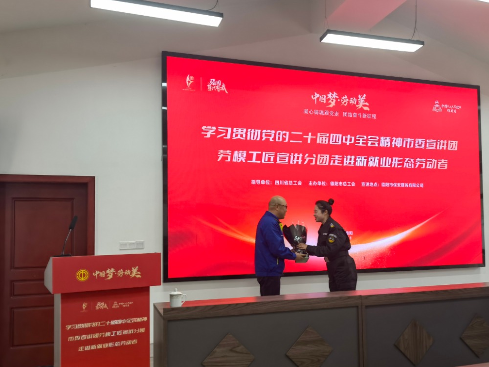 近日,德阳市总工会主办的劳模宣讲会走进城发集团旗下德阳市保安服务有限公司。活动特邀四川省劳动模范、东方电气集团东方汽轮机有限公司首席技师杨军作专题报告,公司干部职工代表现场聆听,公司工会主席出席并讲话。旨在以精神赋能为集团四季度攻坚注入强劲动力。