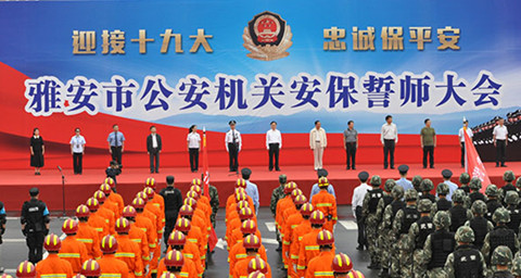 本网讯(通讯员 朱鹏飞)为深入推进“迎接十九大、忠诚保平安”主题教育和“四对照四提升、做忠诚卫士”专项教育,为十九大胜利召开奠定坚实的思想基础、组织基础和队伍保障,确保良好的社会治安环境。9月15日雅安市公安局在万达广场举行全市公安机关“十九大安保誓师大会”,公安民警、武警支队、消防官兵、特巡警支队、交警支队、群防群治队和保安队伍组成的16个方队代表参加,副市长、市公安局党委书记、局长马宏出席并作动员讲话。