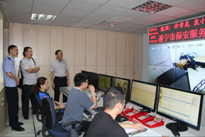 饶支队长一行在赵文兴总经理的陪同下,参观了遂宁保安公司技防分公司报警中心及押运网点、押运车辆运行实时监控系统。饶支队对押运网点、押运车辆运行实时监控系统等给予了高度评价,并称赞公司在抓押运勤务管理上具有典型性和代表性,率先实现了押运勤务安全 “人防和技防的高度融合”。在参观结束后,饶支队长一行还就公司经营、队伍管理及安全工作情况听取了赵总经理的专题汇报。当赵总经理汇报到公司推行“以责任书、承诺书和工作目标量化规范工作秩序”的时候,饶支队长连连点头,并且不时插话说:遂宁公司以签订《经营目标责任书》、《队伍管理责任书》、《安全工作责任书》、《遵纪守法承诺书》和对工作目标进行量化为载体,不断强化队伍管理和狠抓经营工作,此举有特色、有借鉴意义。