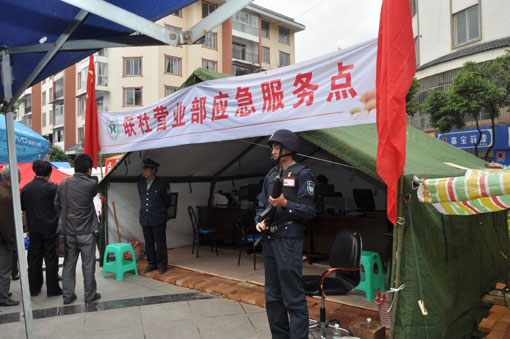 本网讯(通讯员朱鹏飞)4月20日8时02分,雅安市芦山县发生7.0级强烈地震,雅安市保安公司所辖子公司、分公司均有不同程度的受损,为开展好抗震救灾工作,加强救灾的统一指挥领导,在地震发生后,总公司立即启动紧急预案,一是安排各保安值守岗位尽职履职,公司总经理陈德康第一时间带领公司相关人员赶赴芦山,了解和掌握重灾区基本情况,做好相关协调部署工作,对受灾队员进行慰问。二是根据公安局领导安排,协助做好抗震救灾一线民警相关后勤保障工作,同时及时为来雅救灾前线的领导提供装备保障。三是及时抢修“110”联网报警被损设备,确保金融网点安全运行。四是协助市局指挥中心做好报警设备的搬迁移机工作,确保金融网点的“110”联网报警不受影响。五是做好银行网点的运钞工作,现有4个流动网点(芦山3个、宝兴1个),每个网点安排1名队员协助银行工作人员,确保网点的顺利运行。